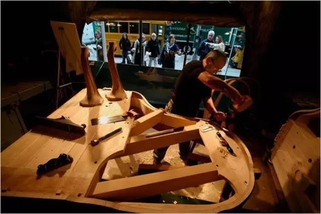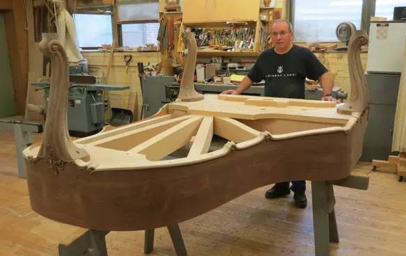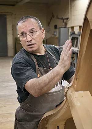Santé的熱情極富感染力。因此,他曾不止一次參加巡展,向世界展示制造鋼琴琴體的工藝。他曾在57號(hào)大街上施坦威展示廳的櫥窗里制造鋼琴,在芝加哥的施坦威鋼琴展示中心制造鋼琴,在曼哈頓中城舉行的音樂教師協(xié)會(huì)年會(huì)上制造鋼琴,甚至在長島的一家購物中心里制造鋼琴。“顧客進(jìn)來,會(huì)問我問題,我向他們介紹我怎么做琴體,怎么做琴腿。”他說,“我想,能親眼看到這一工藝,客戶一定覺得非常有趣。他們非常樂意聽,我也很高興向他們展示,并且樂此不疲。”