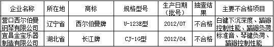 國家質檢總局近日在其官網公布了鋼琴產品質量國家監督抽查結果。結果顯示,西爾伯曼牌、長江牌2種產品不合格,涉及到白鍵下沉深度、踏瓣控制性能、踏瓣負荷、標準音、琴鍵負荷項目。